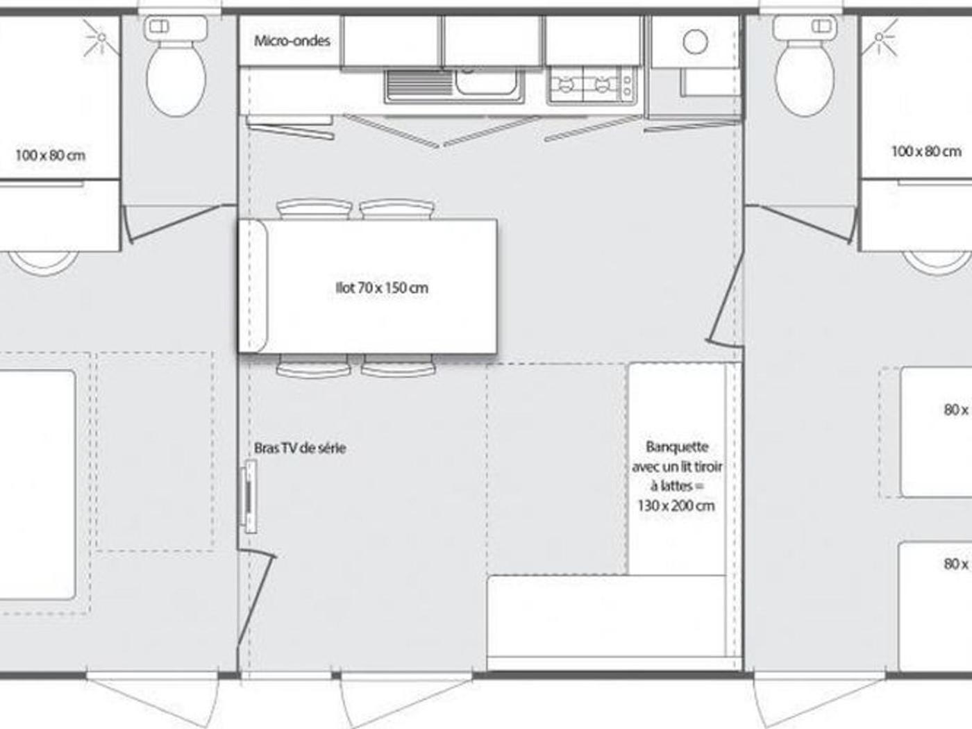 Mobile Home. This mobile home includes 2 bedrooms, kitchen, a terrace and 2 bathrooms with a hairdryer. In the fully equipped kitchen, guests will find a refrigerator, a dishwasher, kitchenware and a microwave. This mobile home has a private entrance, a coffee machine, a TV and outdoor furniture.