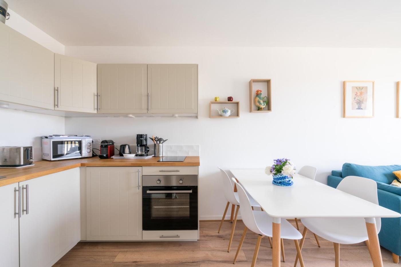 Appartement 1 Chambre. This apartment comes with 1 living room, 1 separate bedroom and 1 bathroom with a shower and free toiletries. Meals can be prepared in the kitchen, which features a refrigerator, kitchenware, an oven and a microwave. This apartment has a washing machine, a tea and coffee maker, a TV with cable channels and a balcony. The unit has 2 beds.