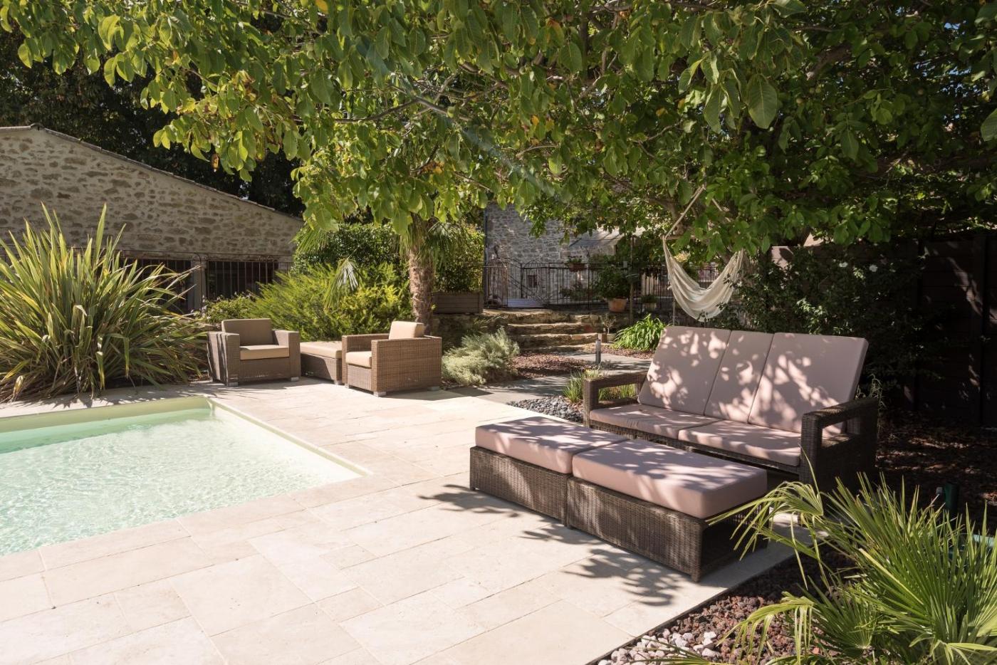 Chambre Double avec Salle de Bains - 3. This double rooms special feature is the pool with a view. Offering free toiletries and bathrobes, this double room includes a private bathroom with a bath and a hairdryer. The fully equipped kitchen has a stovetop, a refrigerator, a dishwasher and kitchenware. The spacious air-conditioned double room offers a flat-screen TV with satellite channels, a private entrance, soundproof walls, a coffee machine as well as garden views. The unit has 1 bed.