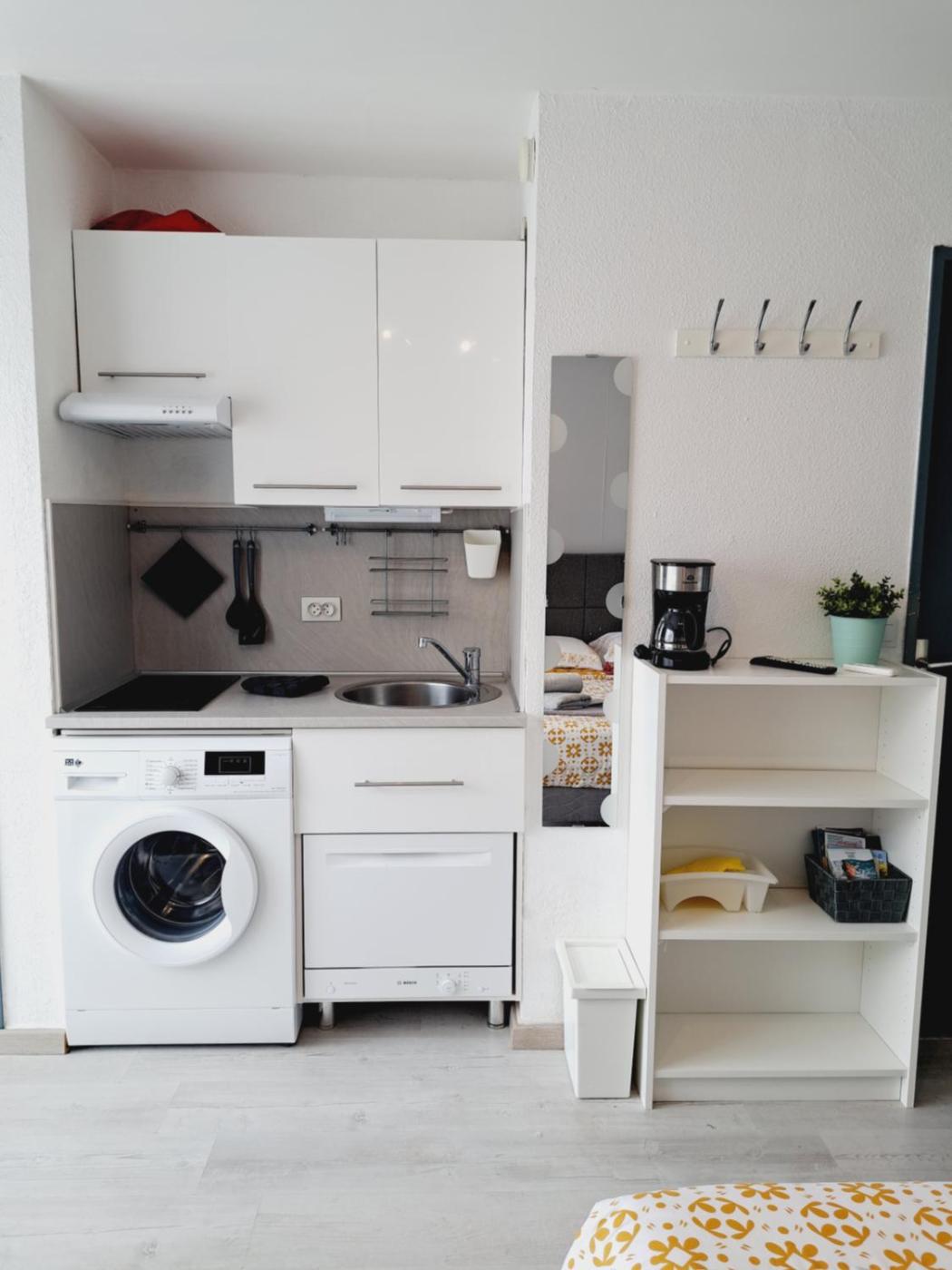 Studio. This studio features a kitchen equipped with a microwave, ceramic hot plates, a dishwasher, a coffee machine, an electric kettle, a toaster and a refrigerator with a freezer. The living room comes with a sofa bed and a flat-screen TV. The sleeping area has a single bed and a wardrobe. The bathroom is fitted with a shower and a toilet. Bed linen and towels are provided.