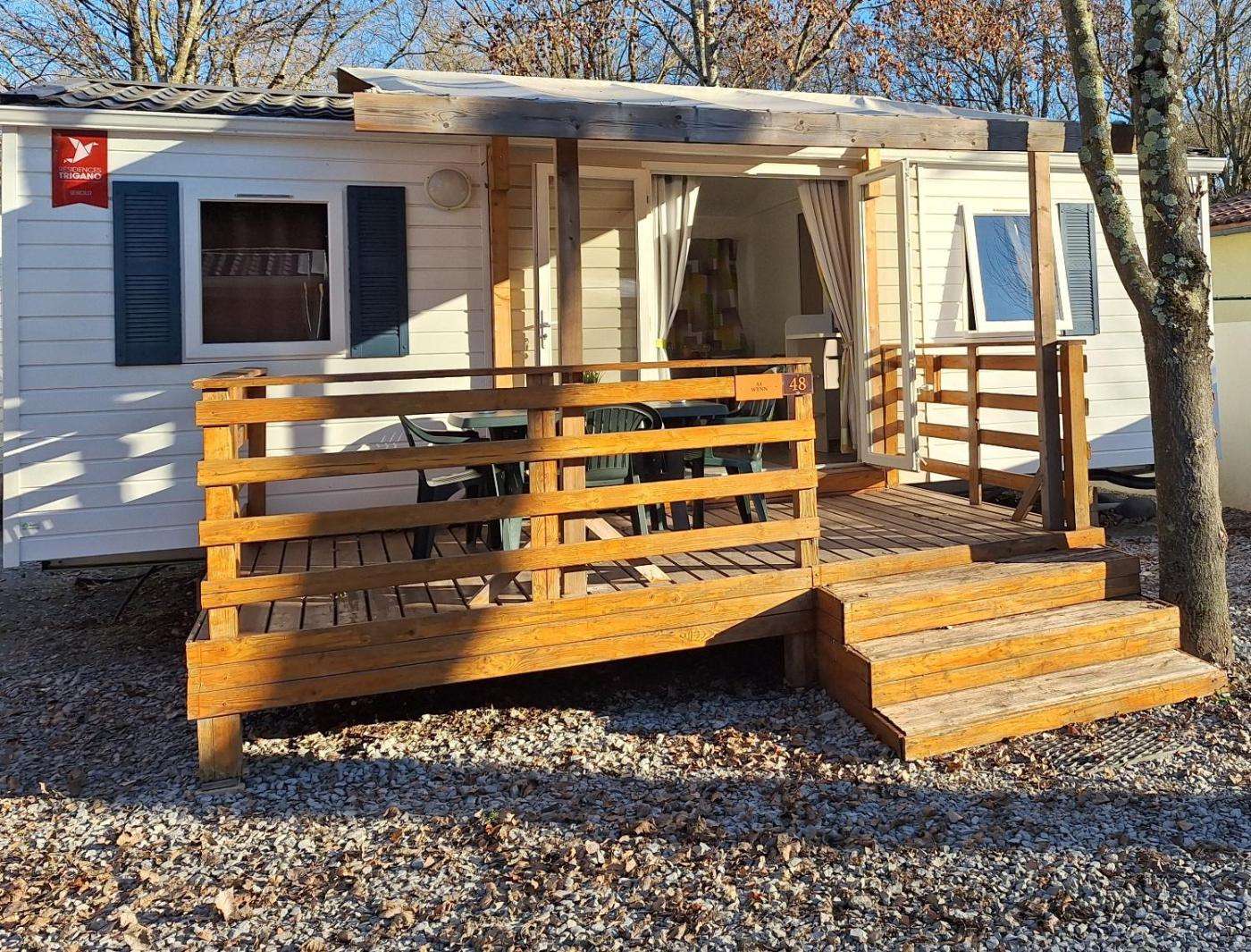 Mobile Home 2 Chambres. Ce mobile home comprend un salon, 2 chambres séparées ainsi qu’une salle de bains avec douche. Vous pourrez préparer vos repas dans la kitchenette bien équipée munie de plaques de cuisson, d’un réfrigérateur, d’un micro-ondes et d’ustensiles de cuisine. Ce mobile home dispose d’une machine à café, dun coin salon, dune terrasse et de mobilier de jardin. Ce logement comporte 4 lits. ;