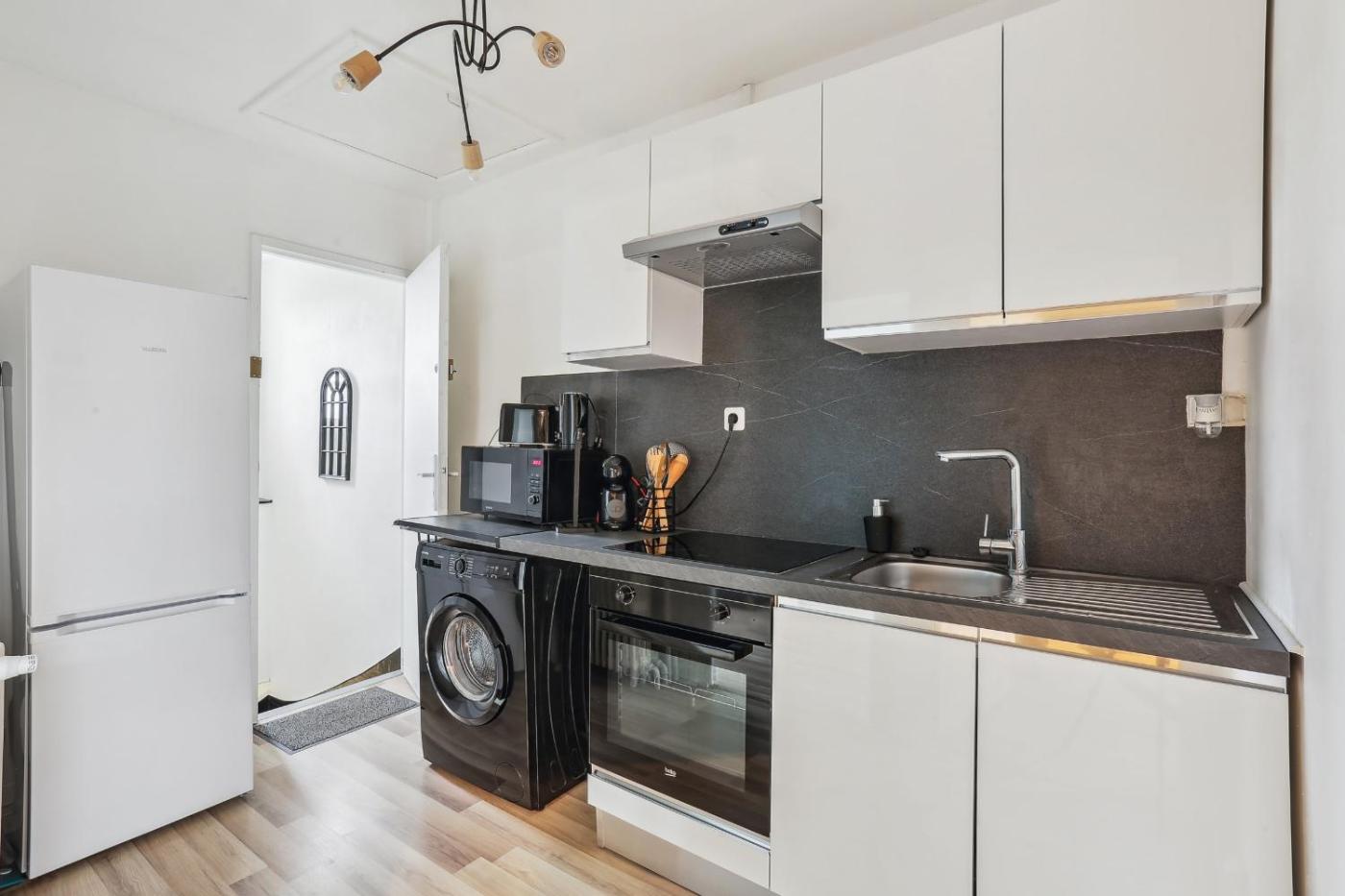 Cet appartement comporte 1 chambre, une cuisine avec un réfrigérateur et un four, ainsi que 1 salle de bains avec une douche, des articles de toilette gratuits et un lave-linge. Des serviettes et du linge de lit sont disponibles.