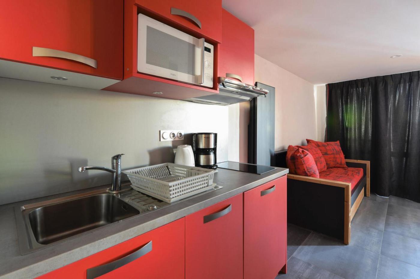 Studio. The studios kitchen, which features a dishwasher, is available for cooking and storing food. This studio provides a TV.