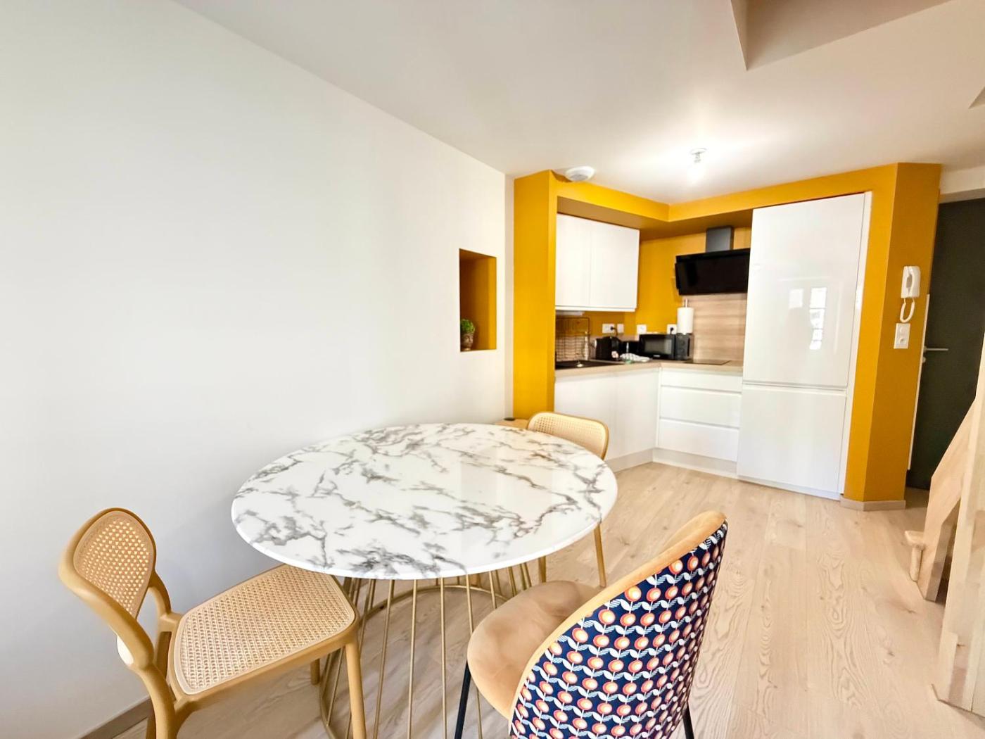 Appartement 1 Chambre. Boasting a private entrance, this apartment also comes with 1 bedroom, a seating area and 1 bathroom with a shower and a hairdryer. Meals can be prepared in the kitchen, which features a refrigerator, kitchenware, a microwave and a toaster. The apartment features a washing machine, a coffee machine, a dining area, a TV with satellite channels, as well as city views. The unit has 1 bed.
