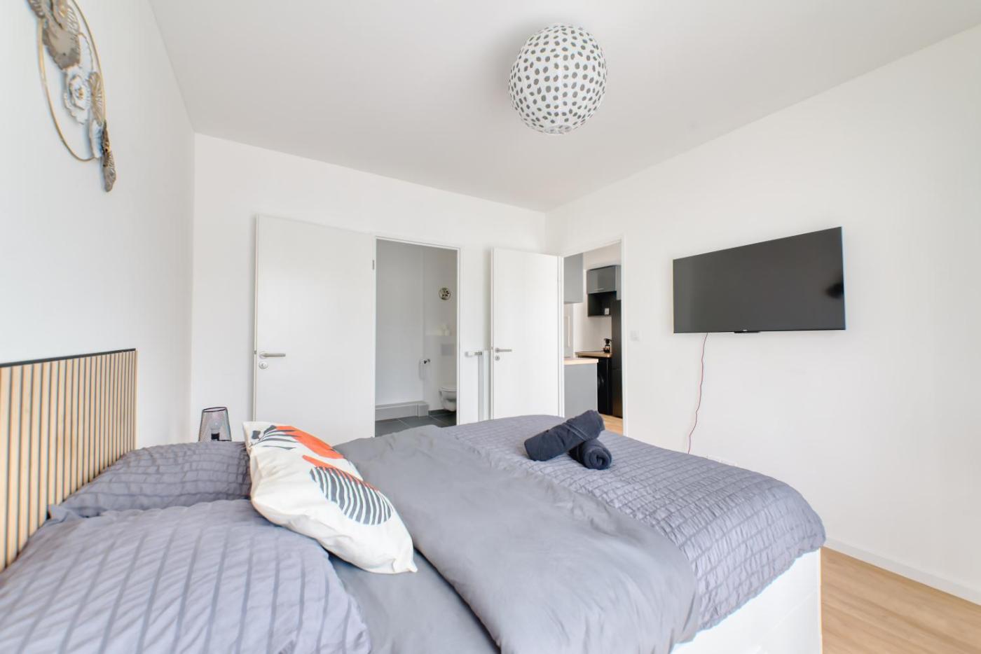 Appartement 1 Chambre. Featuring a private entrance, this apartment comprises 1 living room, 1 separate bedroom and 1 bathroom with a shower and a hairdryer. In the well-equipped kitchen, guests will find a stovetop, a refrigerator, an oven and a toaster. The apartment features parquet floors, a seating area with a flat-screen TV, a washing machine, a tea and coffee maker as well as city views. The unit offers 3 beds.