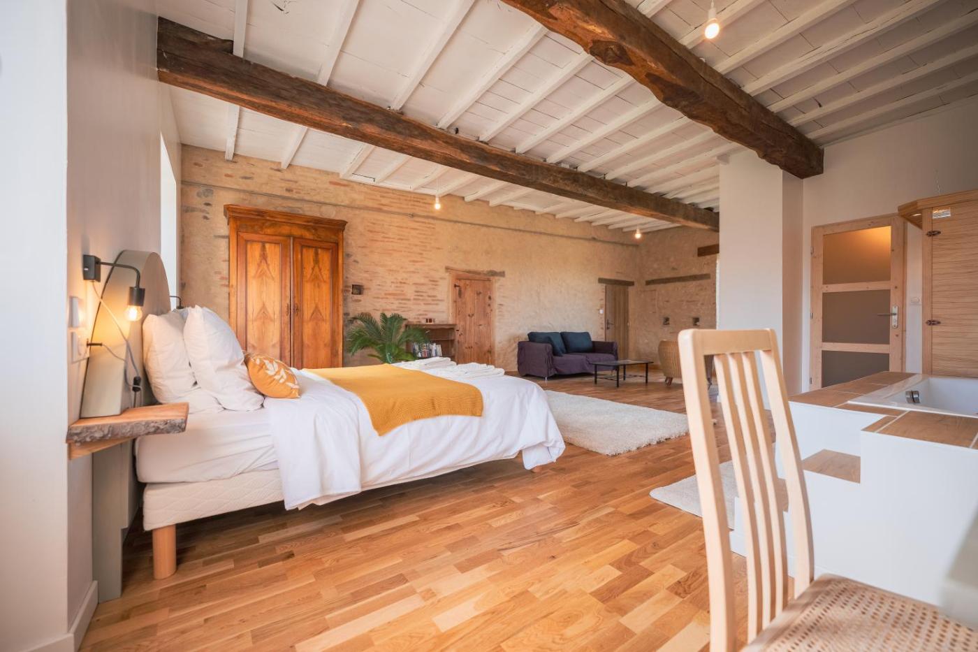 Chambre Double Deluxe avec Baignoire. This double rooms standout features are the hot tub, spa bath and sauna. The spacious double room features a seating area, a wardrobe, as well as a private bathroom boasting a walk-in shower and a hairdryer. The double room features parquet floors, a sofa, an electric kettle, heating as well as garden views. The unit has 1 bed.