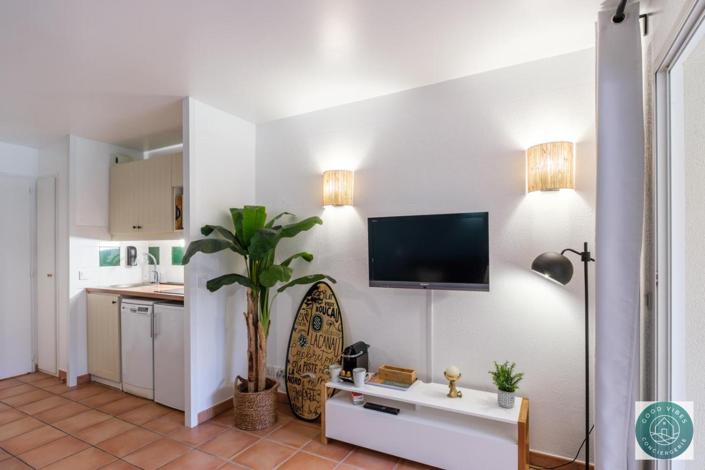 Appartement 1 Chambre. Boasting a private entrance, this apartment includes 1 living room, 1 separate bedroom and 1 bathroom with a bath and a hairdryer. In the fully equipped kitchen, guests will find a stovetop, a refrigerator, a dishwasher and kitchenware. Featuring a terrace with garden views, this apartment also offers a tea and coffee maker and a flat-screen TV. The unit has 2 beds.